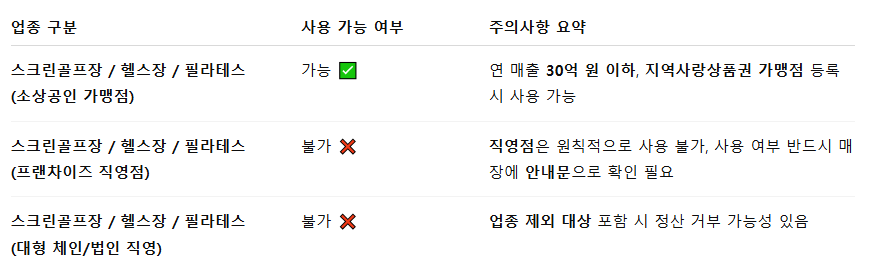 1. 민생회복 소비쿠폰 사용불가 업종에 체육시설이 있지 않기 때문에, 연 매출 30억원 이하의 지역사랑상품권 가맹점이라면 사용이 가능합니다.