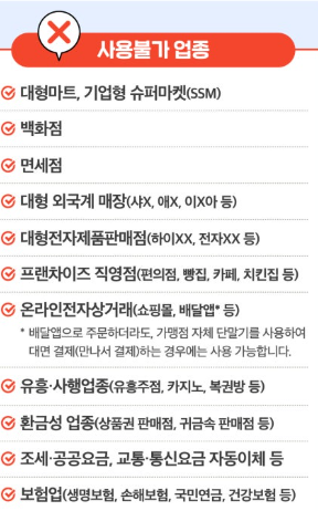 반면, 대형마트, 백화점, 온라인 쇼핑몰(일부 예외 제외), 프랜차이즈 직영점, 배달앱 자체 결제 시스템 등에서는 사용할 수 없어요.