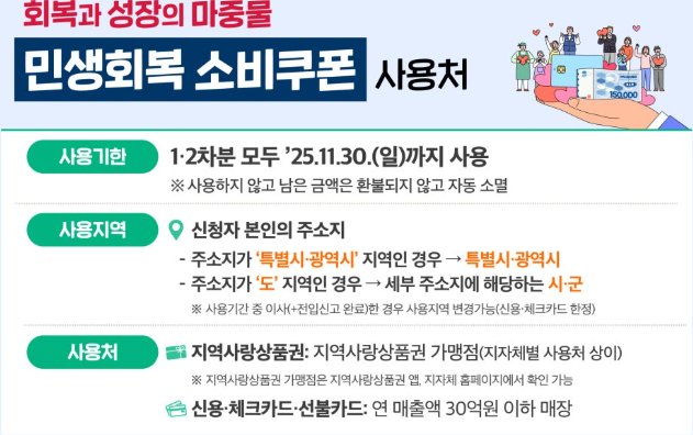 민생소비쿠폰 사용기한은 1차와 2차 모두 2025년 11월 30일까지로 동일하므로 반드시 그 안에 사용해야 해요.